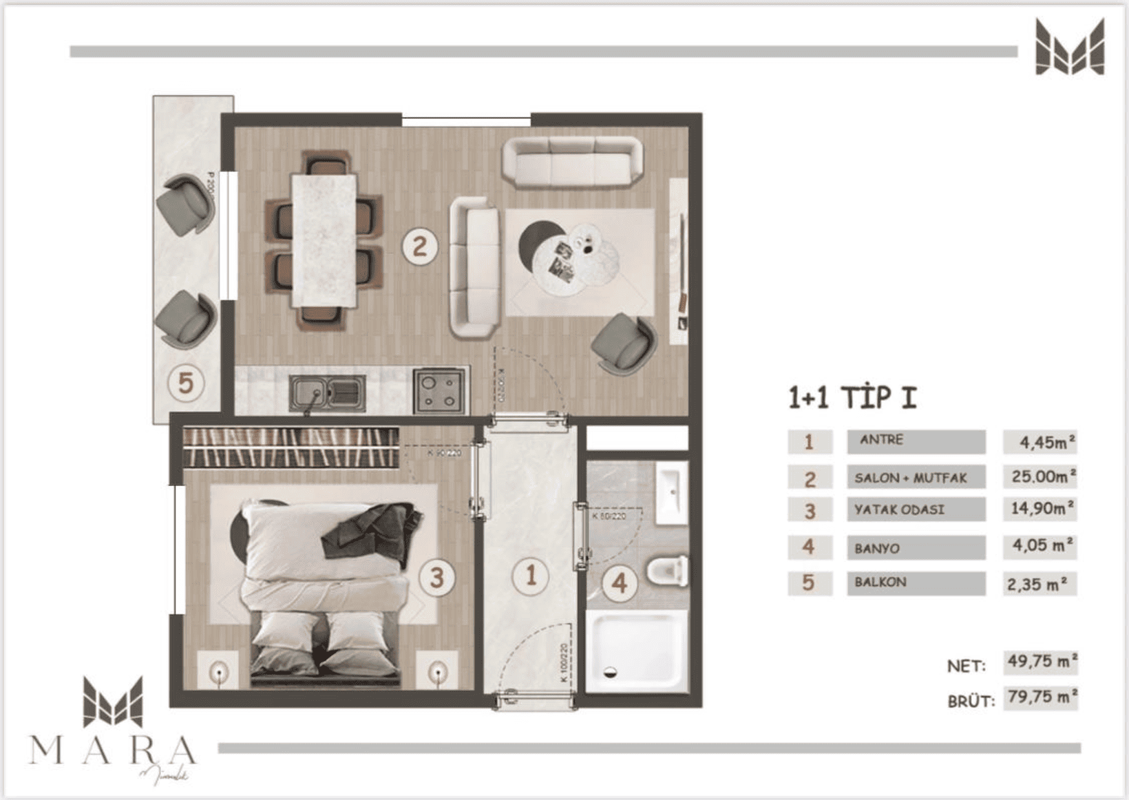 Квартира формата 1+1 в проекте ARIA MARIN — это современное жильё, созданное для комфортной городской жизни рядом с морем. Планировка включает светлую гостиную с кухней открытого типа и отдельную спальню, что делает пространство удобным как для проживания, так и для инвестиций.