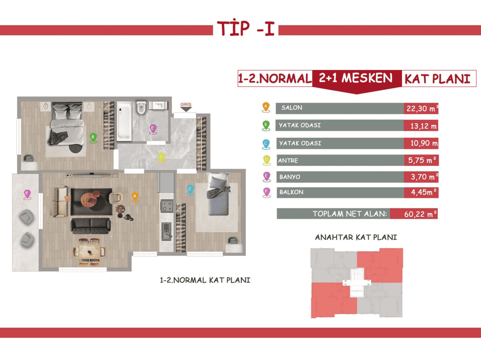 Квартира формата 2+1 в проекте ARIA MARIN — это просторное и функциональное жильё для комфортного проживания семьи. Планировка включает светлую гостиную с кухней, две отдельные спальни и удобные зоны хранения, что обеспечивает практичность и уют.